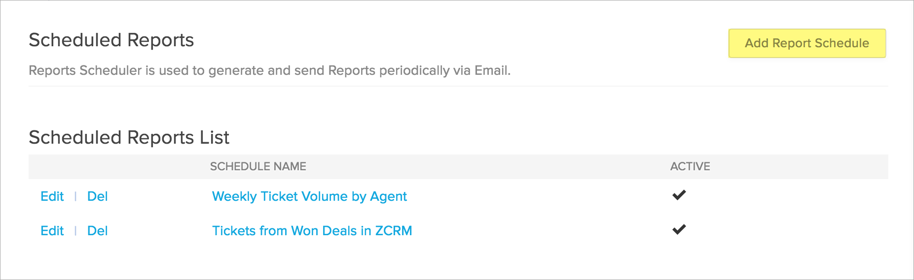 - Os relatórios agendados estão disponíveis apenas na edição Enterprise do Zoho Desk.