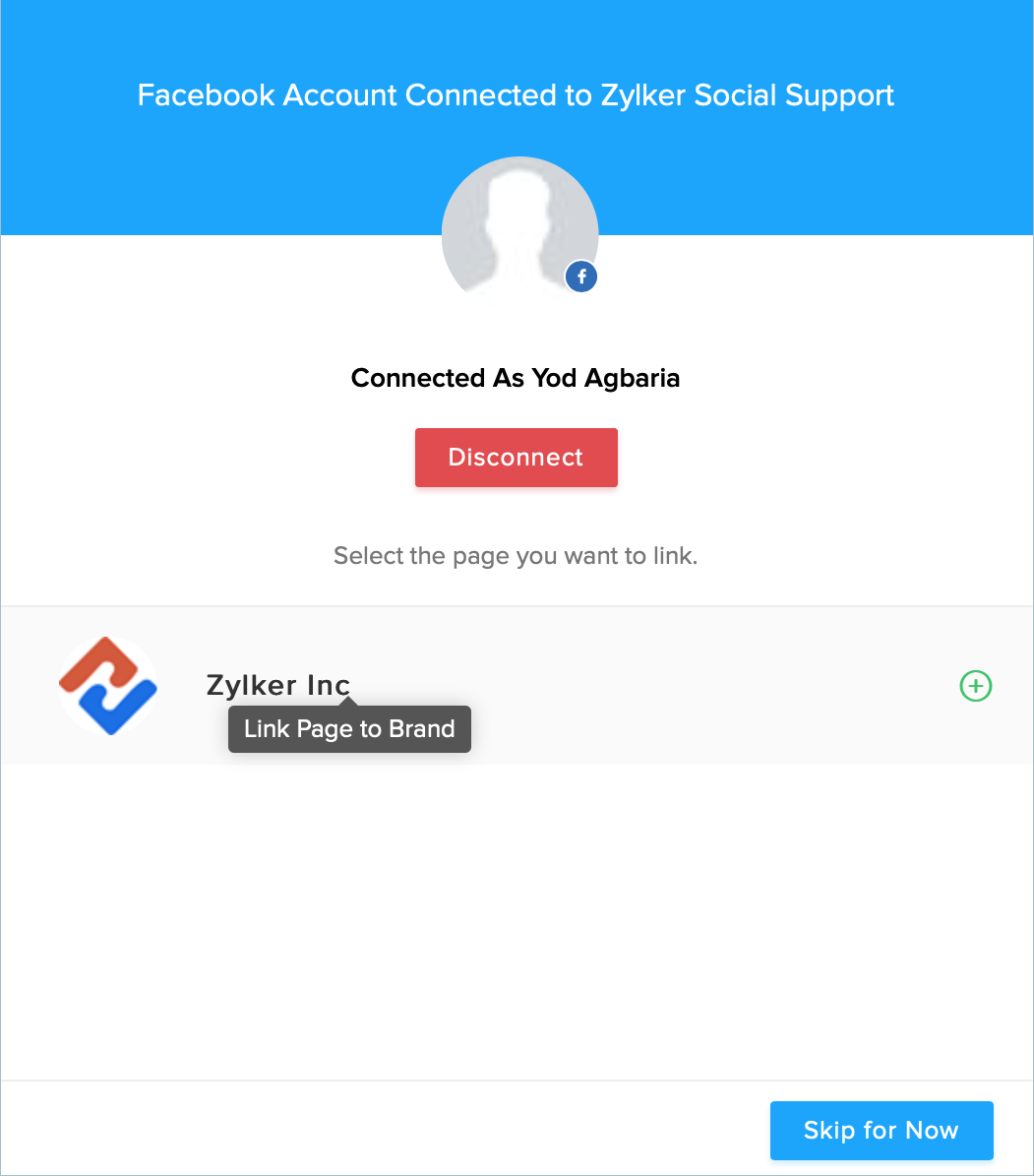 Autorizando acesso do Zoho Desk ao FacebookA página está vinculada à sua marca e a tela de detalhes individuais da sua página do Facebook é exibida.