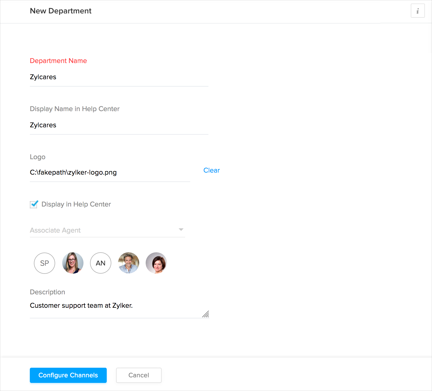 Logo: Navegue e selecione um logotipo para o departamento. O logotipo é usado para identificar o departamento na Central de Ajuda
